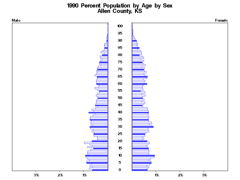 | Allen County, KS 1990 Population by Age by Sex | |||||