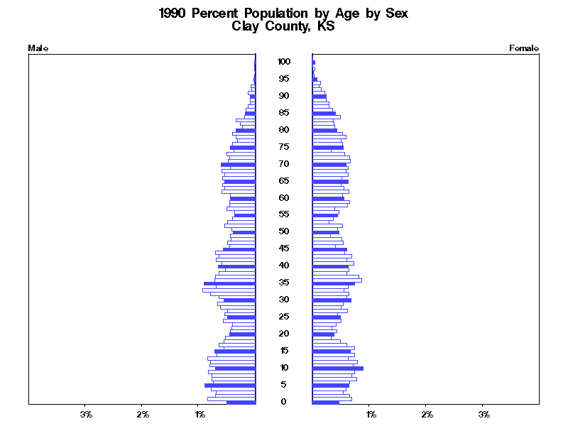 | Clay County, KS 1990 Population by Age by Sex | |||||