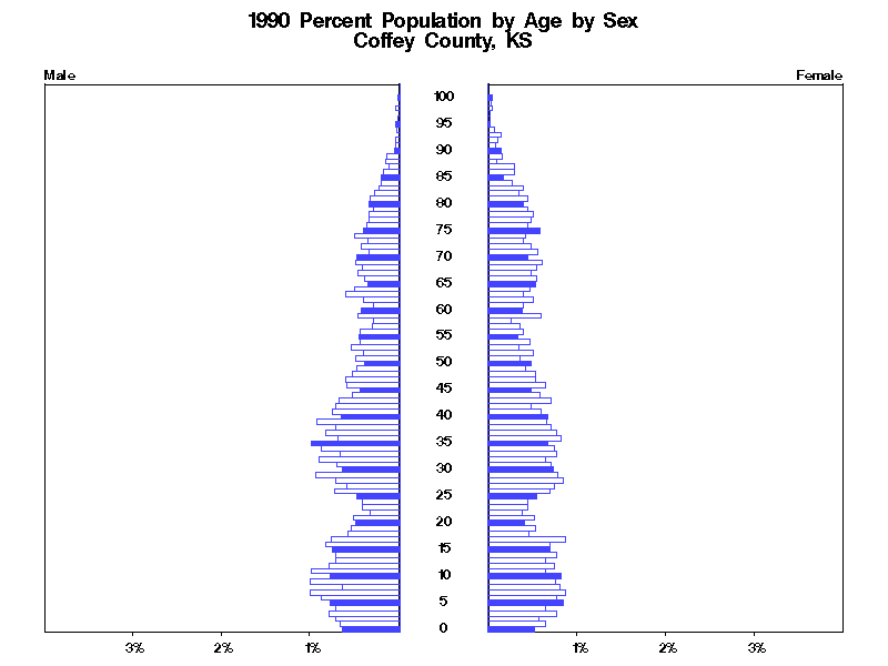 | Coffey County, KS 1990 Population by Age by Sex | |||||