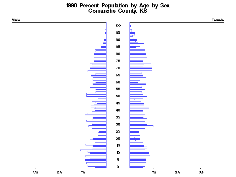 | Comanche County, KS 1990 Population by Age by Sex | |||||