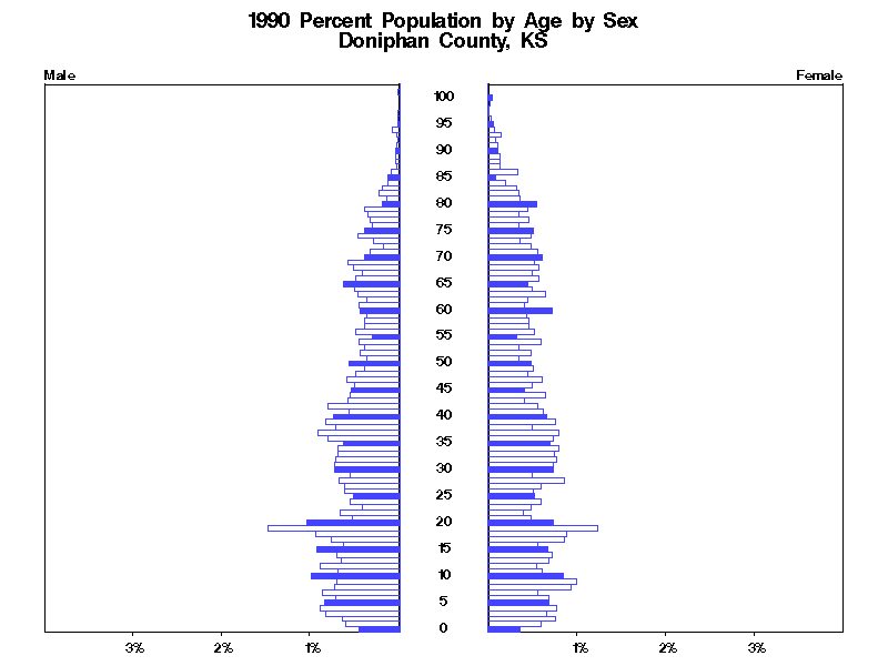 | Doniphan County, KS 1990 Population by Age by Sex | |||||