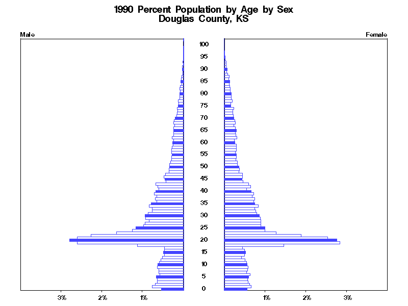 | Douglas County, KS 1990 Population by Age by Sex | |||||