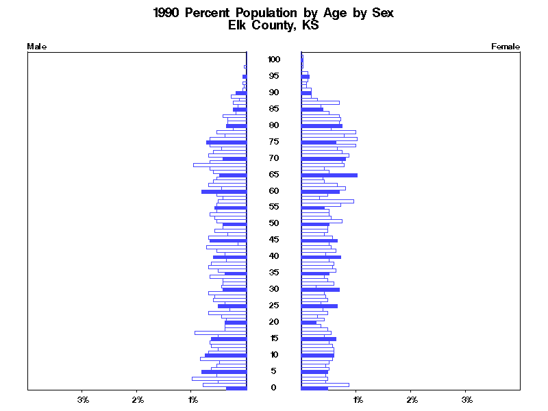 | Elk County, KS 1990 Population by Age by Sex | |||||