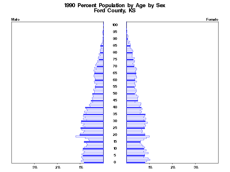 | Ford County, KS 1990 Population by Age by Sex | |||||