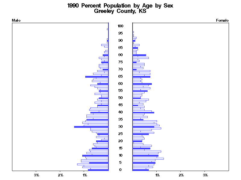 | Greeley County, KS 1990 Population by Age by Sex | |||||