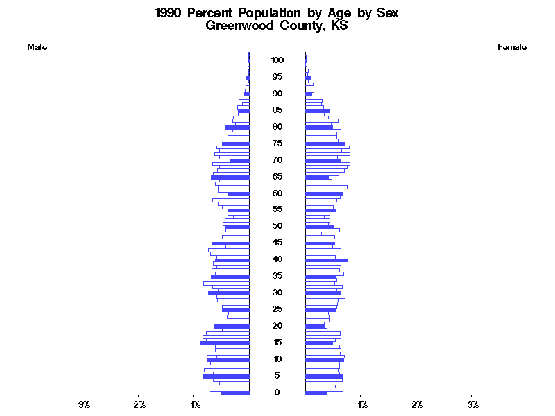 | Greenwood County, KS 1990 Population by Age by Sex | |||||