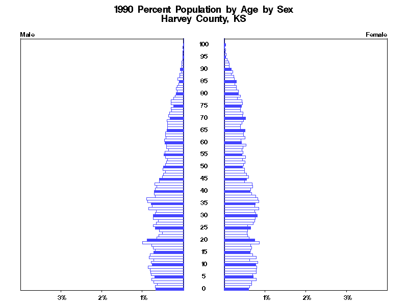 | Harvey County, KS 1990 Population by Age by Sex | |||||