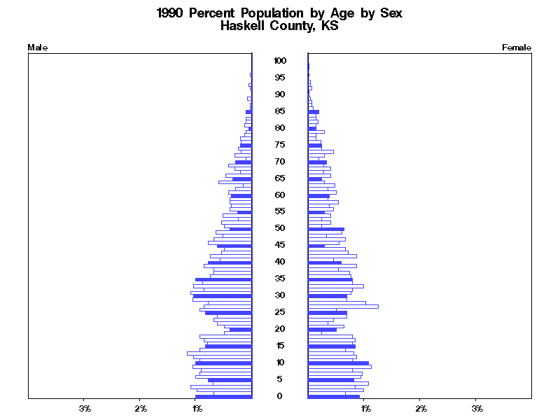 | Haskell County, KS 1990 Population by Age by Sex | |||||