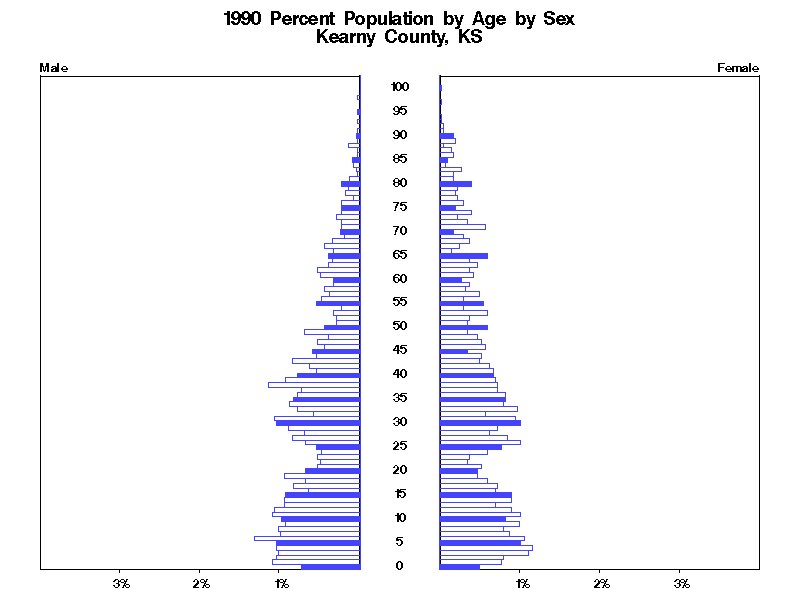 | Kearny County, KS 1990 Population by Age by Sex | |||||