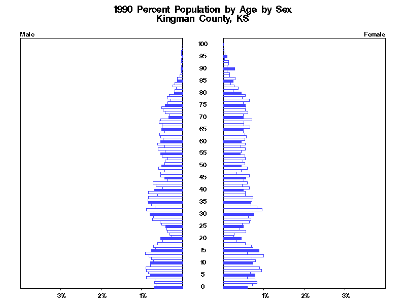 | Kingman County, KS 1990 Population by Age by Sex | |||||