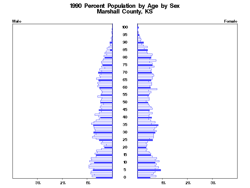 | Marshall County, KS 1990 Population by Age by Sex | |||||