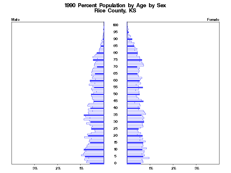 | Rice County, KS 1990 Population by Age by Sex | |||||