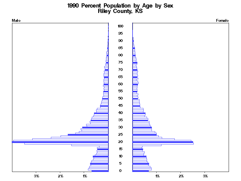 | Riley County, KS 1990 Population by Age by Sex | |||||