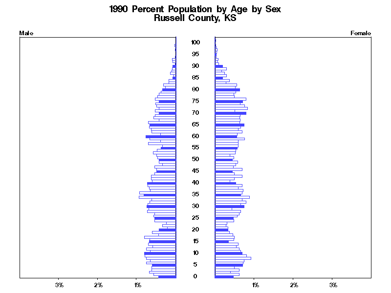 | Russell County, KS 1990 Population by Age by Sex | |||||