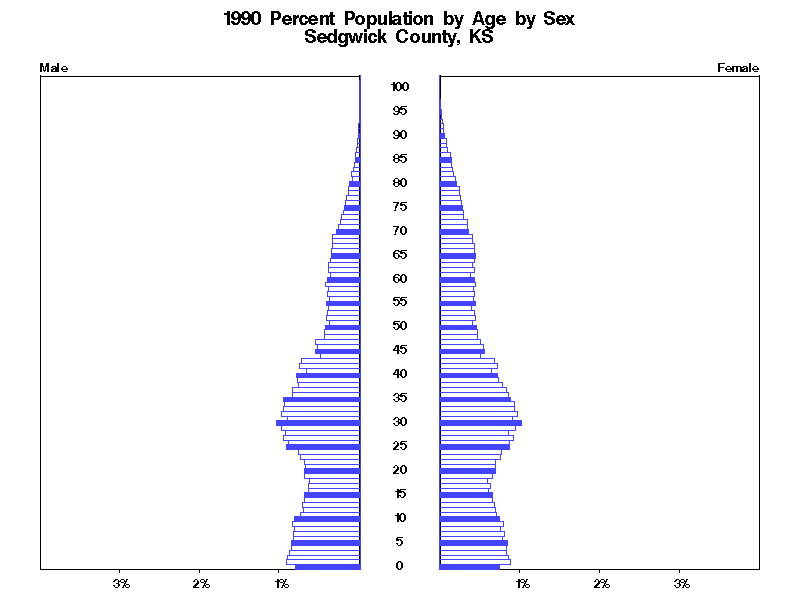 | Sedgwick County, KS 1990 Population by Age by Sex | |||||