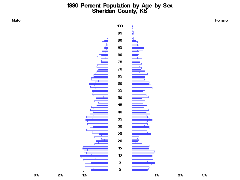 | Sheridan County, KS 1990 Population by Age by Sex | |||||
