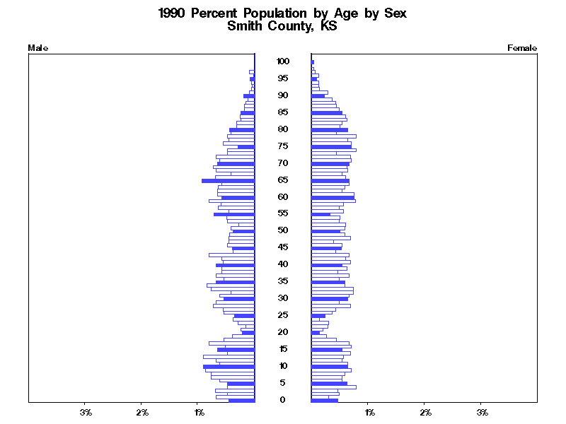 | Smith County, KS 1990 Population by Age by Sex | |||||