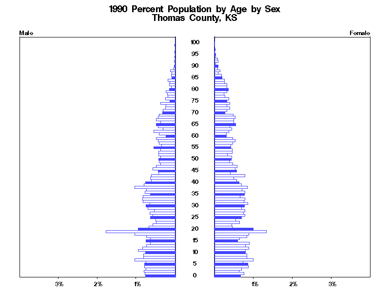 | Thomas County, KS 1990 Population by Age by Sex | |||||