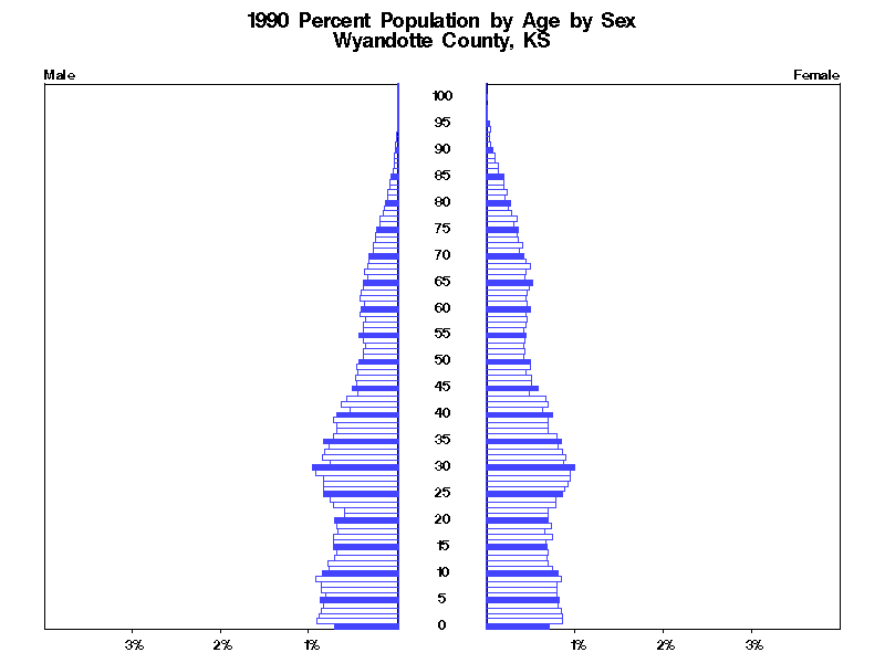 | Wyandotte County, KS 1990 Population by Age by Sex | |||||