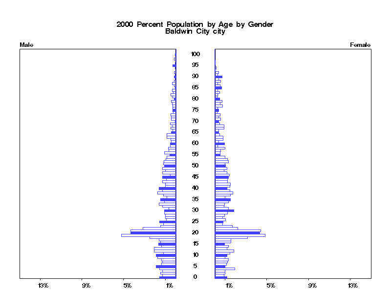 | Baldwin City city 2000 Population by Age by Gender | |||||