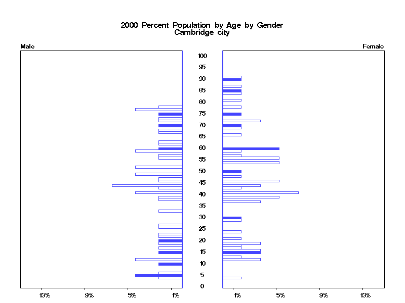 | Cambridge city 2000 Population by Age by Gender | |||||