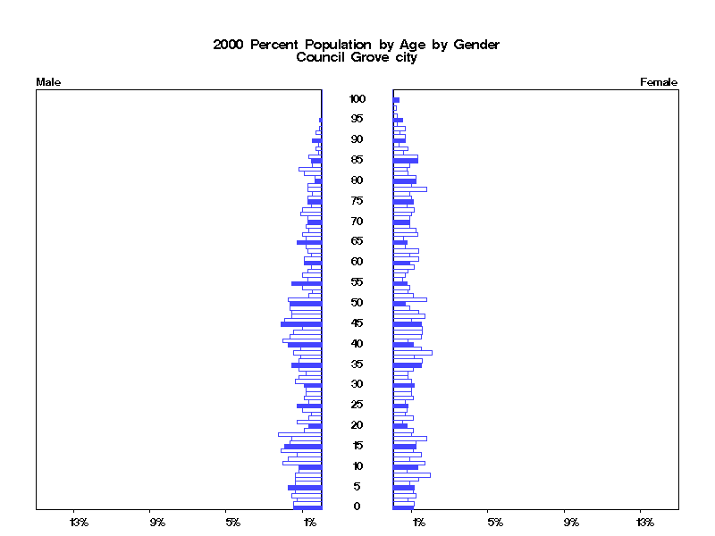 | Council Grove city 2000 Population by Age by Gender | |||||