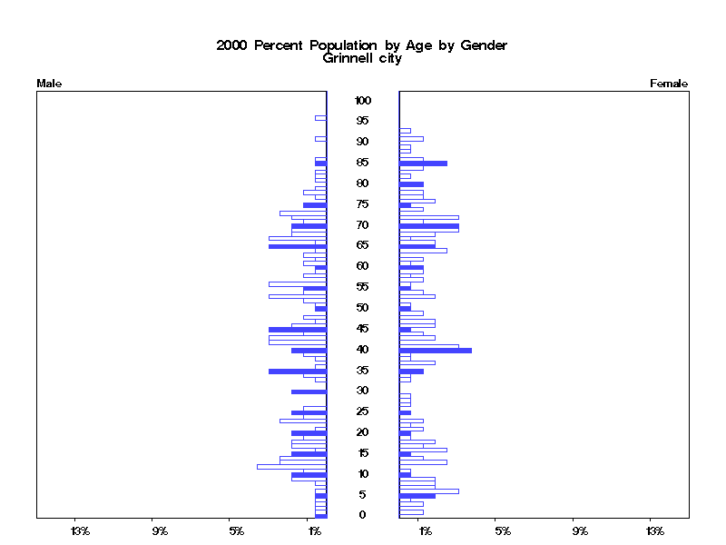 | Grinnell city 2000 Population by Age by Gender | |||||