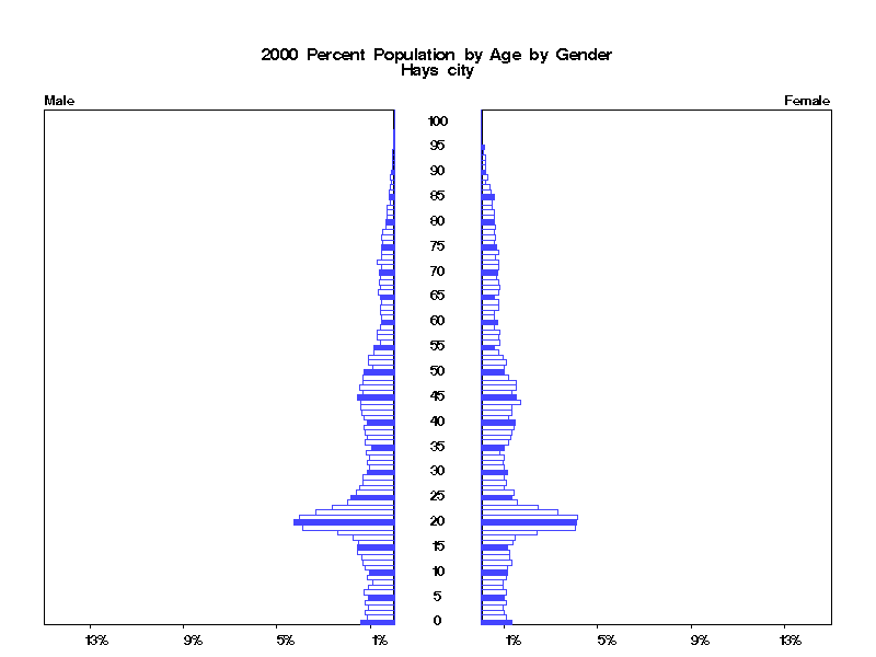 | Hays city 2000 Population by Age by Gender | |||||