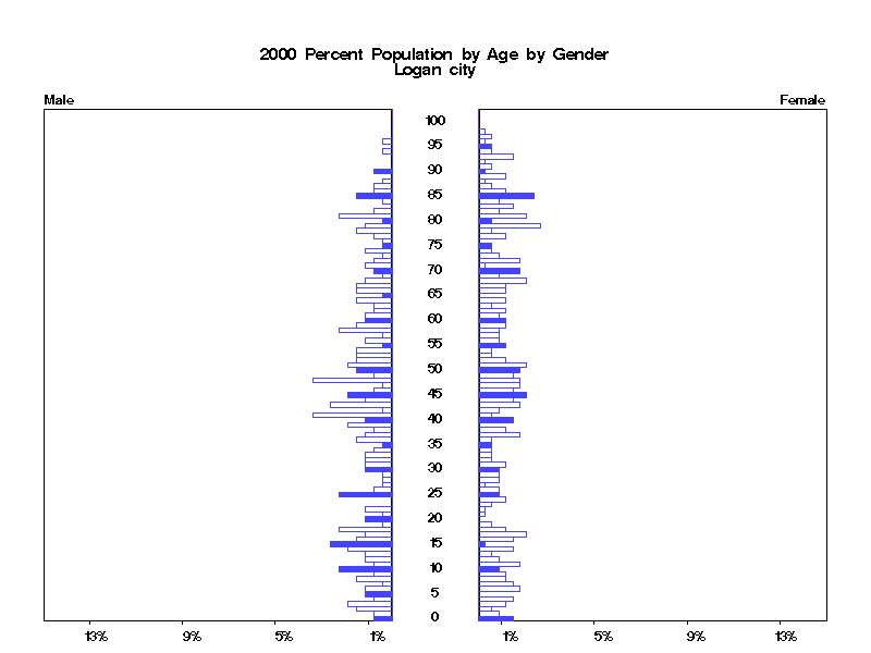 | Logan city 2000 Population by Age by Gender | |||||