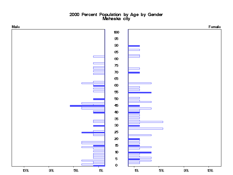 | Mahaska city 2000 Population by Age by Gender | |||||