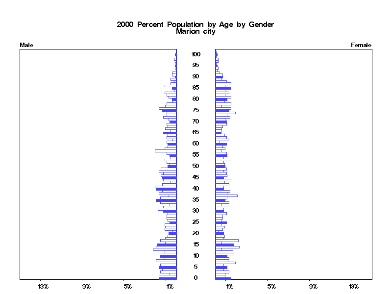 | Marion city 2000 Population by Age by Gender | |||||