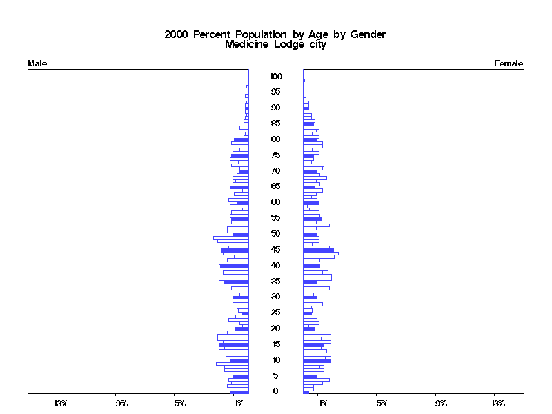| Medicine Lodge city 2000 Population by Age by Gender | |||||