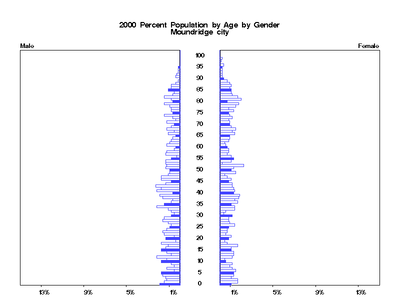 | Moundridge city 2000 Population by Age by Gender | |||||