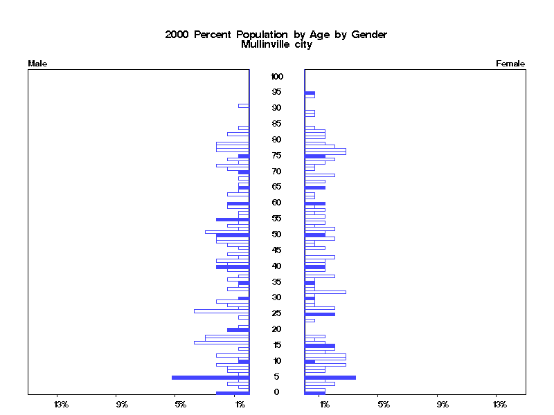 | Mullinville city 2000 Population by Age by Gender | |||||