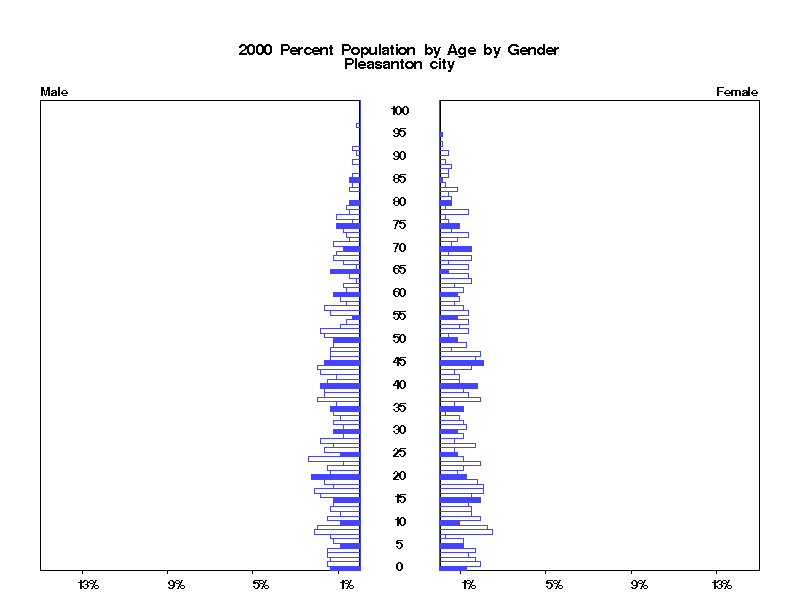 | Pleasanton city 2000 Population by Age by Gender | |||||
