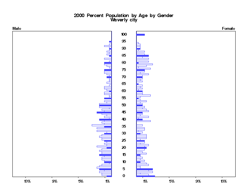 | Waverly city 2000 Population by Age by Gender | |||||